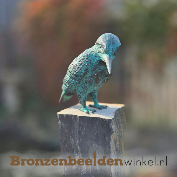 Informatie over dit ijsvogel beeld op leisteen sokkel voor in de tuin