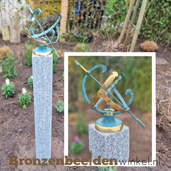 Kleine bronzen zonnewijzer van 25 cm hoog en breed met granieten sokkel van 90 cm hoog, 12 cm breed en 12 cm diep.