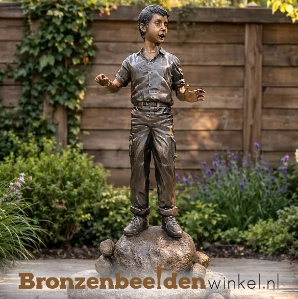 Bronzen tuinbeeld genaamd: "Jongetje staand op een kei"