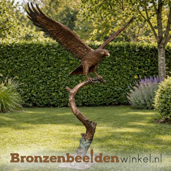 Een arend beeld die net gaat opvliegen van een boomstam, welke ook helemaal in brons is gegoten. Dit beeld is maar liefst 1.75 meter hoog!