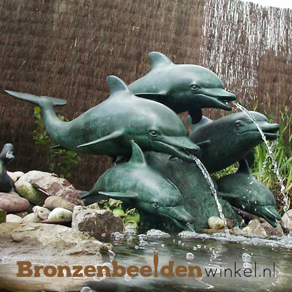 Tuinbeeld dolfijnen van vijf bronzen dolfijnen. Bij dit waterornament komen de waterstralen uit de monden van de dolfijnen. De dolfijnen zijn in een groene bronstint afgewerkt Een echte eyecatcher voor aan uw vijver.