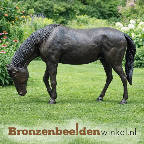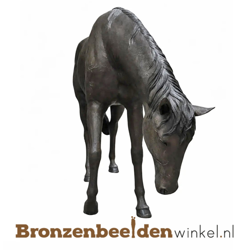 Een groot paard beeld in brons gegoten van maar liefst 2.30 meter breed! Een ware eyecatcher in uw tuin.