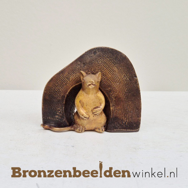 Dierenbeeld van een bronzen muisje die uit zijn holletje komt. Dit muizen beeld kan leuk tegen de wand aan worden geplaatst zodat het net lijkt of dit muisje een echt holletje heeft. Zie ook de 3e foto.
